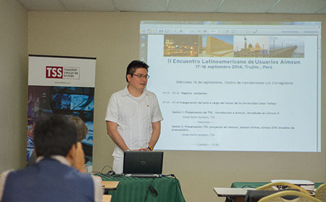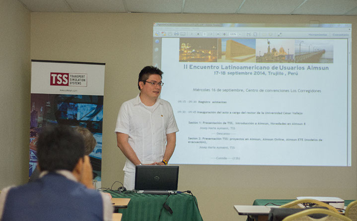II encuentro latinoamericano de usuarios AIMSUN (2014) aperturando el evento junto con el equipo organizador, donde se presento la experiencia de la ciudad de Trujillo en la micro-meso modelación del flujo vehícular y su incidencia en la toma de decisiones, en calidad de asesor técnico en movilidad de Transportes Metropolitanos de Trujillo.