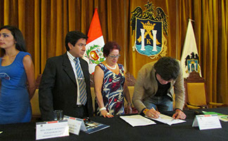 Pacto por la Movilidad (2014) en conjunto con el gerente general de Transportes Metropolitanos de Trujillo y la representante del observatorio ciudadano Trujillo Ahora!, firmando el documento que postula un modelo de desarrollo sostenible para la ciudad.